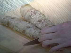 ⑨豚バラをまな板に置いて、一口大で輪切りにする